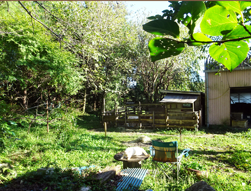 秋 風がさわやか。ヤギ達を見ながら、本を読み、ノッコは隣で昼寝です。
