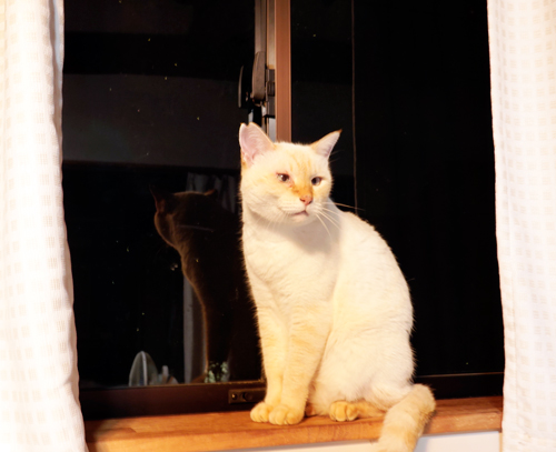 庭で猫ろがっていると、家人から、帰るよと声がかかると、一緒に帰宅、寝るまで、室内で動き回り甘える、かまってもらって、夜窓外を見るのもお約束。そしてお休み。