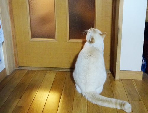 玄関の引き戸は、自分で開けられるが、開けてくれるのを待っている。