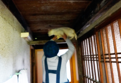 室内で運動会をしていて、テンションがあがると、部屋の縦の柱を一気に駆け上がり、横の梁に飛び乗る。そこまではご機嫌だが、柱から降りられない。困った顔をしていると、奥さんが、踏み台に乗って抱き上げ降ろす。