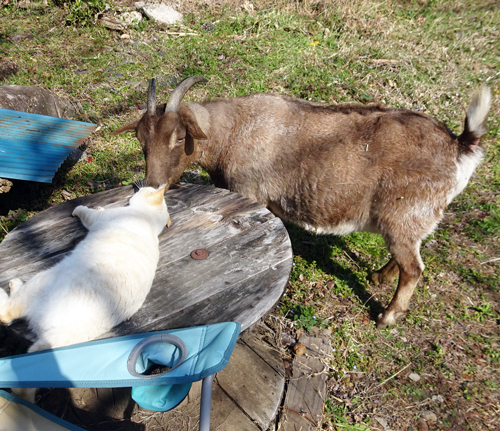 一緒に日向ぼっこをしていると、ヤギのジュンが来て顔を近づけてスキンシップ。普段はシッポをあまり上げないが、シッポ立ててフレンドリーさを表現。ノッコもまんざらでもなし。いつもは、ヤギ来る、ネコ逃げるで遊んでいるが、今回は受け入れています。