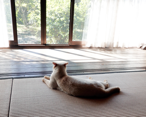 外の陽をを浴びながらのんびり。ネコ世界では、秋です。