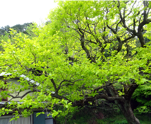 新緑でも、カキの木の緑が好きです。淡い黄色がかった緑から始まり、濃い緑になり、秋には紅葉をして、落葉です。