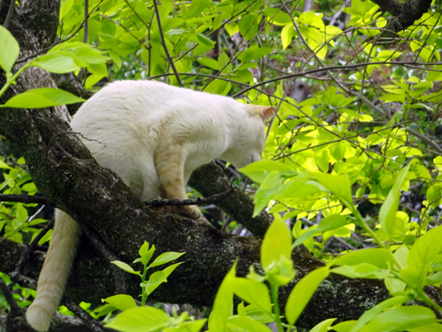 今の時期の新緑が爽やか。樹の下で、デッキチェアから眺めていると、ノッコがトコトコ来てパフォーマンス。二人が見ている事承知しているので、いいところを見せようと木登り。樹の下で、態勢を整え、樹の上まで一気です。跳ぶが如き速さです。