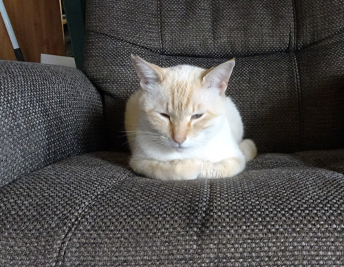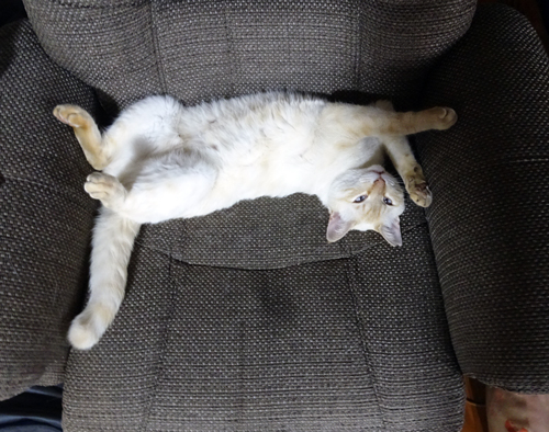 ノッコ 寝場所を変えました。冬はネコベッドで丸まって寝ていたが、暑くなったので、引越しして、リクライニングシート。