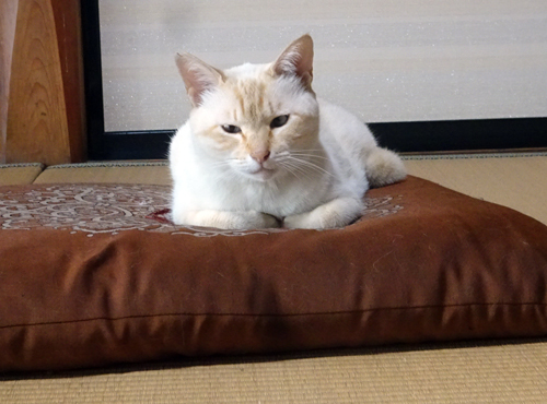 最近は、室内生活が多く、良く寝ている。ご機嫌な居場所は、夜はご主人のリクライニングシートで寝て、昼間は、和室で座布団ネコ。