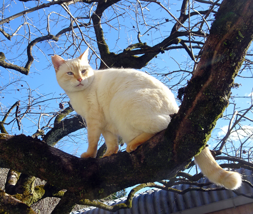今は、地域ネコとの関わりも学習し、かっぷくも良くなり、自分の居場所もあります。カキの樹に登り、楽しみ、周囲に睨みをきかせています。