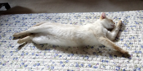 ノッコ 布団の足元の右隅に寝るのがお約束。この場所は寝心地が良いようです。その場所だけ汚れがめだつので、新しい布団シーツを購入。そしたら、早速、寝心地を確かめ、ご機嫌に匂いを付けています。