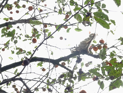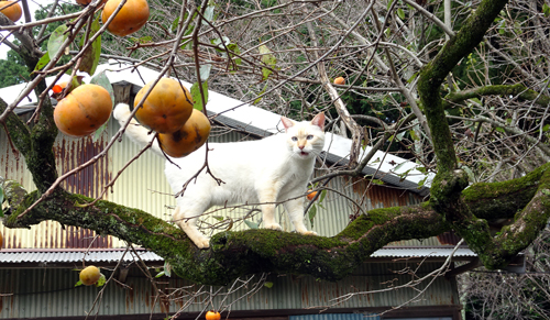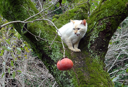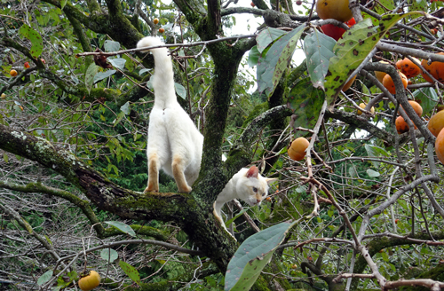 その後は、二人で日向ぼっこをしながらお出迎え。カキの樹に登りパフォーマンス、高い場所に登れるのも、細い枝で歩くのも、一気に降りられるのも不思議。ネコのフィジカル 凄い。
