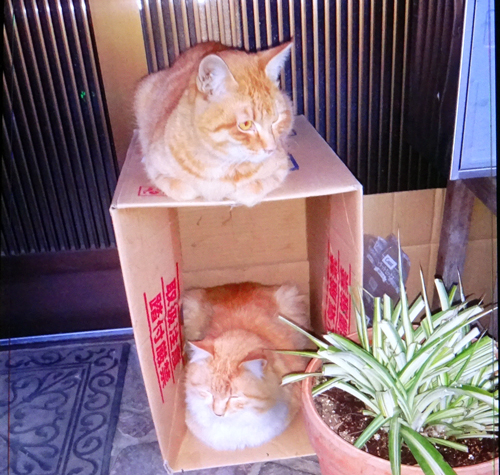 ご近所に、地域ネコの段ボールハウスが。この子達は、日々エサをもらい、ネコハウスは玄関横。二段ベッドでお迎え。人が来ても驚かず、逃げず です。