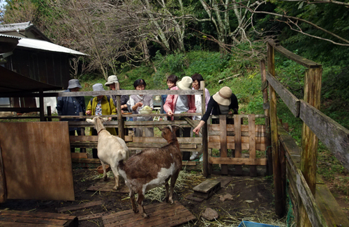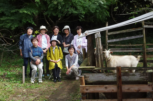 早速 ヤギ舎のメイとジュンをみて、可愛いと、キャベツや乾燥サツマイモを差し出し、二人パクパク食べ、ヤギもウエルカムと愛嬌を振りまいていました。皆で、集合写真を撮り、メイも参加です。家周囲の自然を満喫、古民家の広間で歓談。