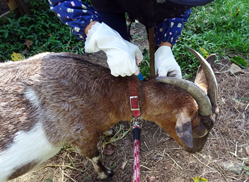 ヤギも同様に、予防接種を月2回。感染すると腰麻痺となり足腰が立たなくなります。ワクチンを皮下接種。首筋に注射器で塗布すると、刺激により決まって、オシッコをします。この、刺激反応 可愛いです。