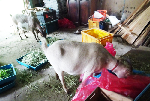 雨時は、ヤギ舎から出ず。小雨時は、散歩には行かないが、隣の農業用倉庫まで、夕食を食べに行きます。濡れないように、頭を下げて一目散です。