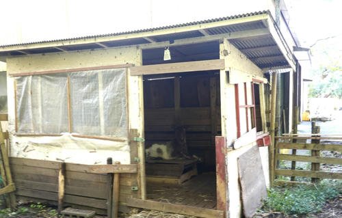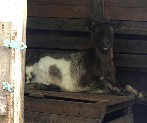 ジュンも心得たもので ヤギ舎内で 座ってリラックス