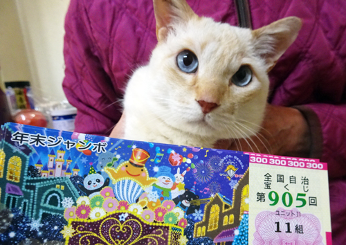 宝くじを購入すると、ノツコとトモに高額当選 お願いと語りかける、ネコさん、イイよ任しなさい、ミャーと返事有り。ネコさん偶然の出会いで二匹家に来た。宝くじ当選も偶然の出会い。当選すれば嬉しいが、一緒に居るだけで嬉しい