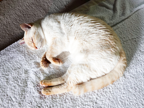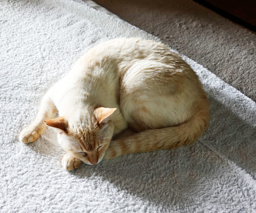 ノッコもあまり外出せず、涼しい部屋で一緒に居る。涼しい部屋で昼間から、眠り猫です。