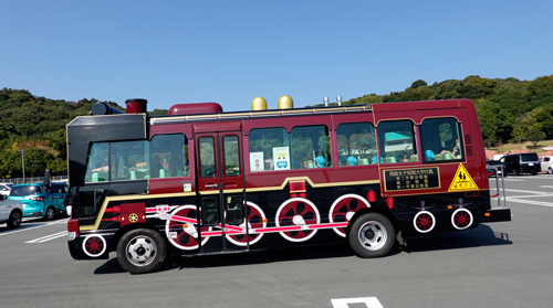 駐車場をSLが走っている。びっくり! よく見ると、幼稚園の送迎バス。これほど凝ったペイントは初めて。見る人喜ぶでしょう。
