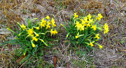 雨で、花々 雨滴を浴びて みずみずしい。咲くツバキも美しいが、落花の紅い絨毯も風情あり。ラッパスイセンも、知らぬうちに花をだしています。