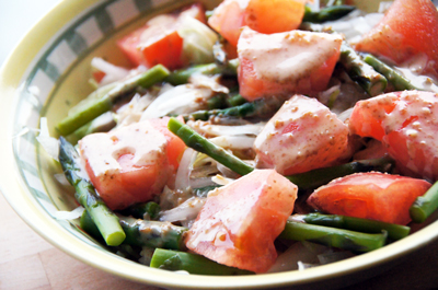 自家栽培のグリーンアスパラガスもサラダに。ネーブルオレンジはデザートに。
