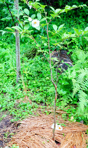 大きく成長した夏つばき1本は可愛そうだが伐採。他の3本は周辺へ移植。春に植えたばかりのアーモンドの木は、変わらず緑が深い。幹が太くなったなつめの木は、根付くかどうかまだ不明。2本植えた夏つばきの1本は、植えた場所の土が瓦礫混じりのせいか成長が遅く、お隣の夏つばきと大きさに成長に差が出て気になっていた。今回ふかふかの土の所に移植したら、蕾がいきいきしてきた。