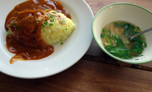 食堂の、ワンコインランチ 懐かしのハヤシライスは大盛況。