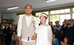 校庭での結婚式予定が、天候により、予定変更し校舎内講堂で行われました。