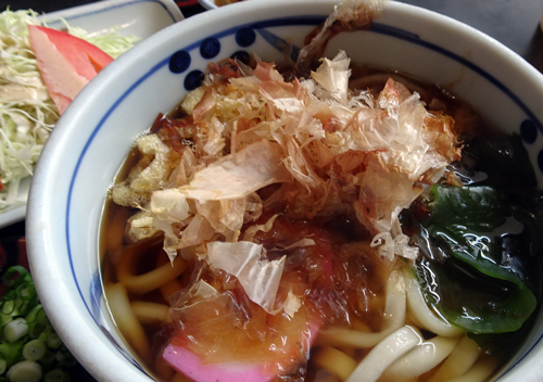 外食のにかけうどん 花かつおが湯気で、揺れている。汁の色は濃いが、甘め。