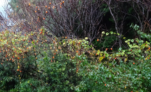 雨の中 朱い実が美しい。カキではありません。カラスウリです。