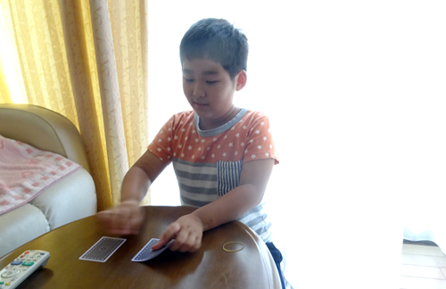 トランプで、最初に見せた絵柄を、机に並べてどれか当てる。ばーちゃんは何度しても外れる、これだと思うカードは違う。これがマジック。