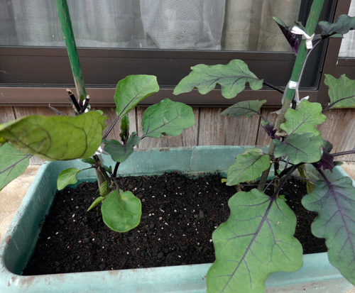 実のなる葉を食べられたナス コンテナに移し、玄関先に置いてある。