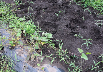 家庭菜園のサツマイモと、インゲンの葉がない。夜行性のシカに食べられたようです。丸くて深い足跡が残っています。楽しみにしていたのに残念。