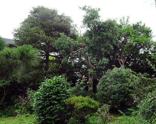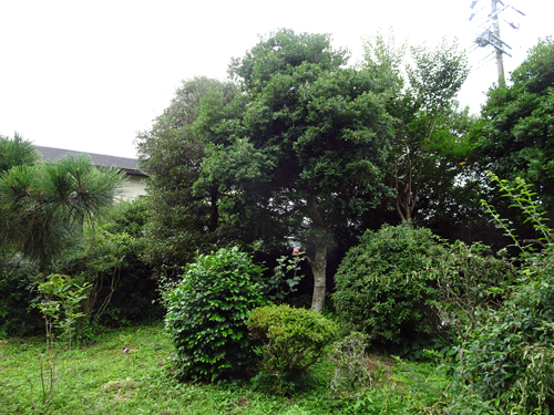 庭の大木 ヤマモモの木が葉を覆い繁って元気いっぱい。隣のやはり大木 モッコクの木の方へ枝を伸ばし、拡張しています。