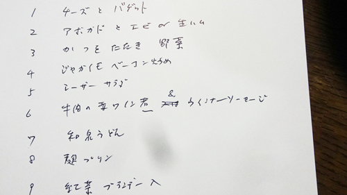 老夫婦と、ご案内を受けた3人。互いに数十年来のお付き合いです。亭主 ワイン大好きで、食事は手作り そしてワイン 5人で5本飲みました。午後から4時間 飲み 食べ おしゃべりです。美味しい料理ばかり、お呼ばれして、食事を撮影するのもはばかれたので、メモの食事メニュー食事を撮影しました。