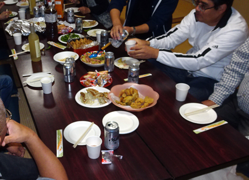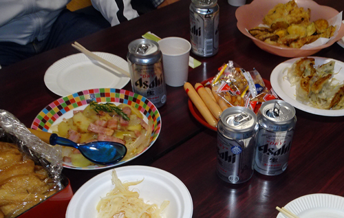 各家庭で、自慢の?お惣菜を持ち寄り、会費で飲物などを購入、会場は地域コミュニティセンターです。何を持ち寄るかは、悩みとお楽しみ。手づくり餃子、天ぷら、ジャーマンポテト、稲荷寿司そしてシフォンケーキが二つは、サプライズで皆大喜び。