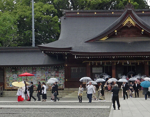 境内では、本殿で結婚式をし、参集殿に向かう人たちと遭遇。小雨の中 しめやかに 進んでいました。