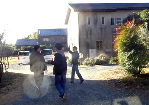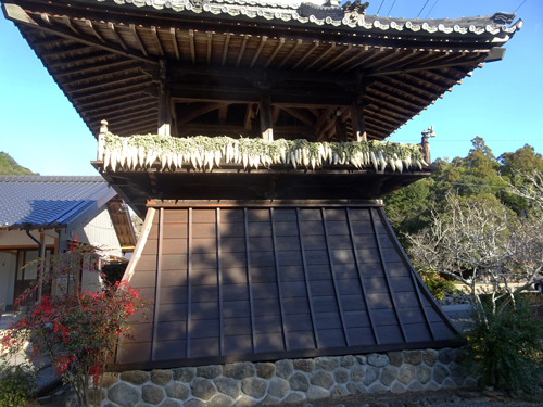 檀家寺へ、正月の付け届け。知り合いの挨拶は、おめでとうございます。鐘つき堂には禅宗らしく干し大根があります。