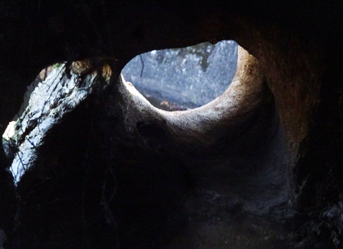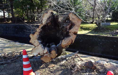 本宮山松源院の山門の傍らに、台風被害の倒木が、切ってありました。太い古木で、木の中心部は空洞化しており、先が見通せる状態でした。覗いて見れば、奥から光が射し込み、樹の寿命尽きたと感じました。先が見通せない事多し。巨木先が見通せ アッパレです。