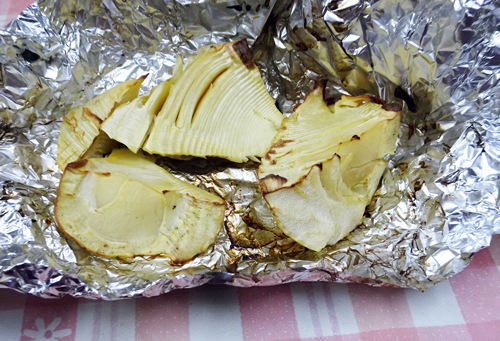 掘りたて→ 即、オーブンで焼き→食べる。花カツオと醤油 オリーブオイルと塩で調理、ほんの少しの調味料。採りたてタケノコ こんなにも甘いのかと驚き。