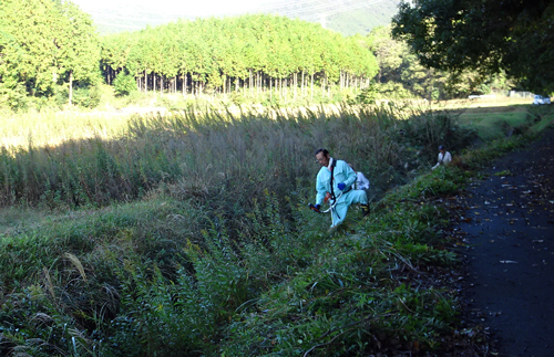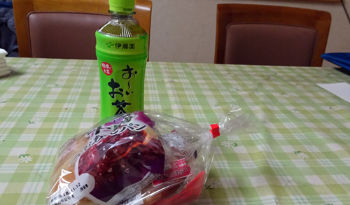 傾斜地の草刈は大変です。作業2時間ほど、雑談して解散。雑談は地域のコミュニケーションタイム これは楽しい。そして、ペット茶と菓子パン2つもらって解散です。