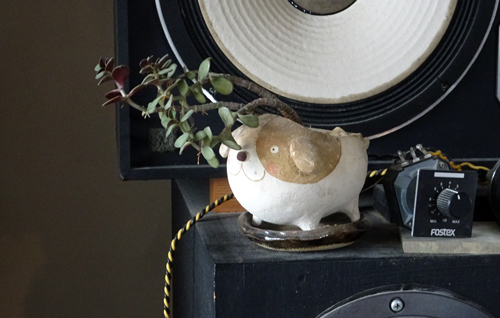 オーディオスピーカーの上には、ワンちゃんが二頭。浜松在住の陶芸家 鶴田季子さん作品で、多肉植物の器も兼ねています。