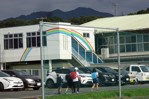 梅雨の合間の晴れ間 遠景の本宮山 中景のレインボー そして通学の児童達。皆 いつも以上に元気 おはようのあいさつも大声。