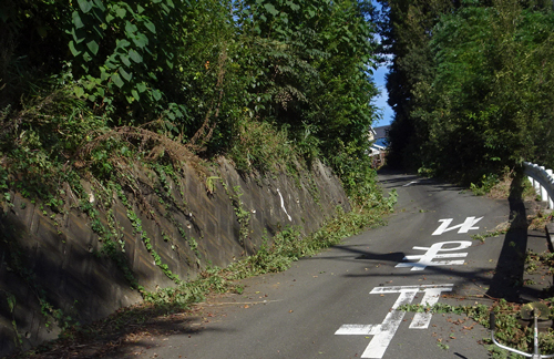 以前は、地域で道普請と称して、市道の側溝清掃や、草刈りをしていましたが、今は共同作業がなくなりました。でも、交通支障のあるところは、地域の人が心配して個人ボランティアで刈っています。写真上は道路に雑草が生繁って、道路幅が狭くなった箇所。下2枚も同様です。