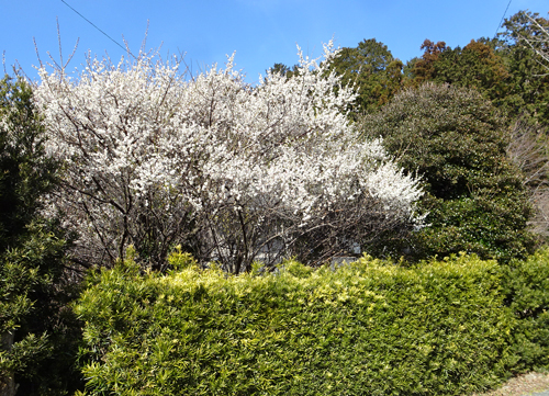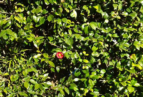 垣根の椿は一輪 庭の梅は、満開 咲いています。