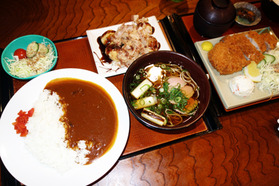 4人の食事は 〇地元産のとんかつと、これも、地元のお米が美味しい、一番人気の穂の国定食 〇季節限定の、鴨南蛮そば 〇シンプルな、カレーライス 〇タコ焼き&ポテトチップ
