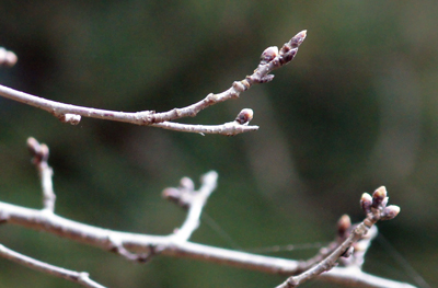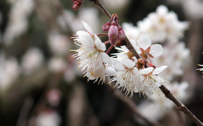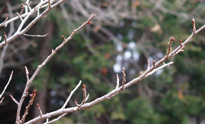 ●彼岸桜 春いちばんに梅と同時に咲きます。花は控えめですが、大きなさくらんぼの実をつけます。さくらんぼは鳥が食べるか、人が食べるか 毎年攻防戦です。