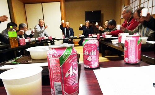 コミュニ―センター和室で、20人余 サクラ模様の缶ビールで乾杯、和気あいあいです。