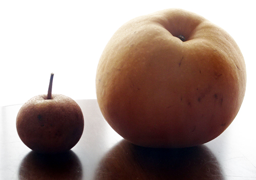 写真は、大きさ異なるが、共に梨です。大きいのは、新高梨 大きく果肉たっぷり、噛むと、甘みとジューシな甘さが口じゅうに広がります。