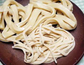 普通サイズの麺との比較です。早速味噌煮込みうどんにしましたが、のど越しツルツルといかず、噛んで噛んでお腹へ。歯ごたえ抜群です。
