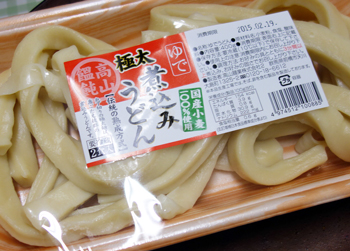 スーパーサンヨネの麺コーナーに、極太煮込みうどんがありました。まさに極太です。