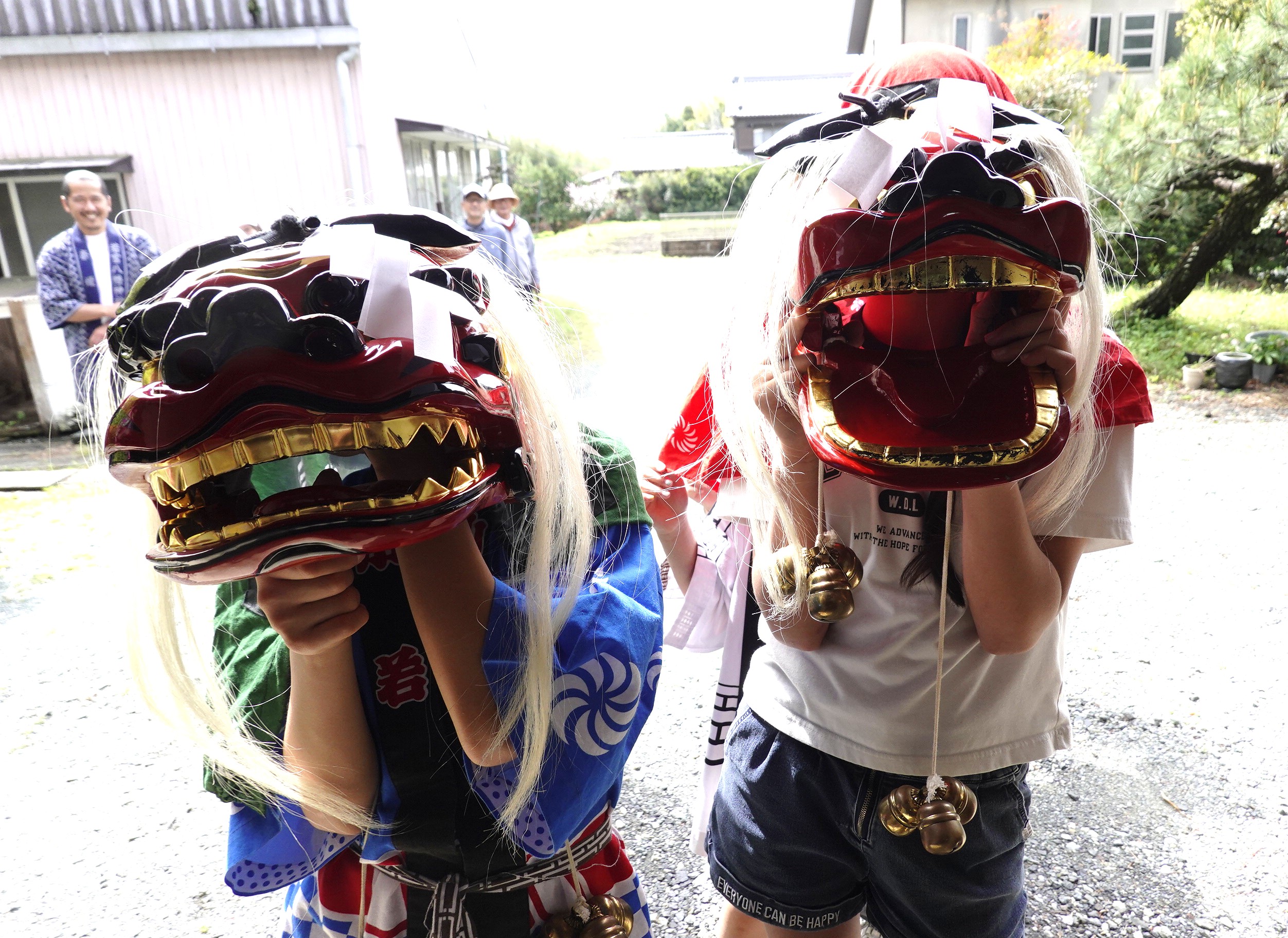 朝子ども獅子が訪問し、おめでとう カツカツとあいさつ 男の子用と 女の子用の2頭の獅子です 女の子用獅子の方が人数が多くて元気がいい 子どもの数より付き添いの父兄の方が多い 500円づつもらい次の家へ